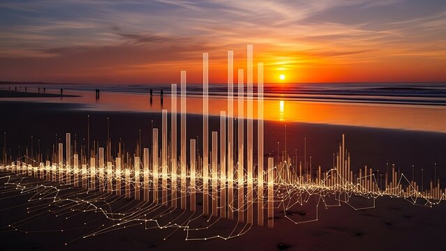 Woman soaking in warm sunlight at coastal horizon, closeup with blue waveform overlay
