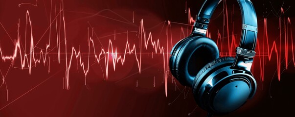Dynamic Headphones with Red Audio Waveform Background