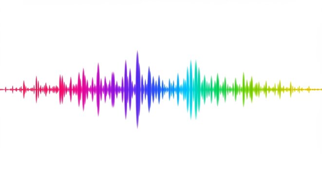 Vibrant rainbow sound waves flow smoothly across white background. AI Generated