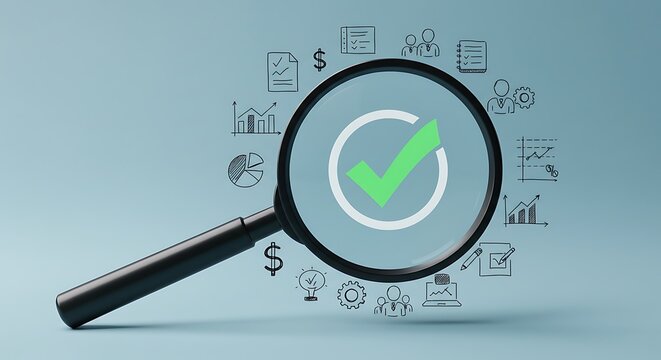 A magnifying glass highlights a green check mark amidst business icons, representing quality assurance and successful validation