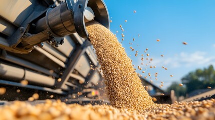 Detailed close up view of the auger mechanism on a grain cart unloading a steady stream of harvested grain