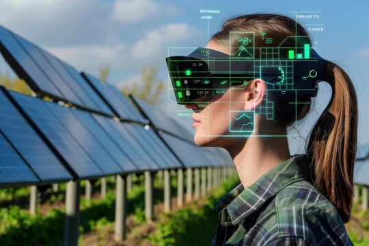 A woman wearing augmented reality goggles inspects a solar panel farm, displaying data overlays.