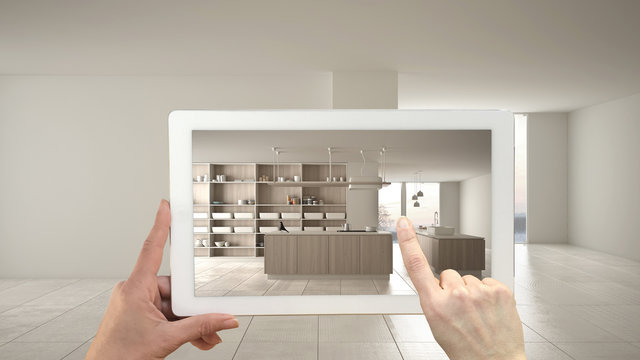 Augmented reality concept. Hand holding tablet with AR application used to simulate furniture and design products in empty interior with ceramic floor, modern white kitchen