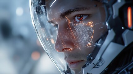 Futuristic Cyborg Man with Digital Face Overlay in Urban Environment