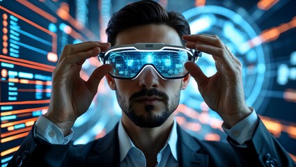 person wearing augmented reality glasses interacts with digital interface, showcasing technology in work environment. scene conveys innovation and focus
