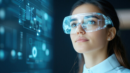Innovative close up of woman wearing augmented reality glasses, engaged with digital educational interface, showcasing advanced technology