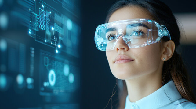 A woman wearing augmented reality glasses interacts with a futuristic digital interface displaying data and holograms in a dark, tech-driven environment.