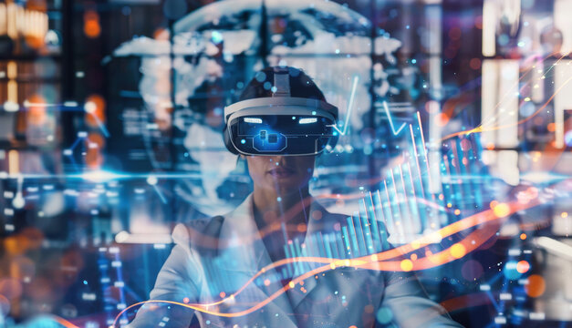 A business executive using an augmented reality headset to visualize live sales metrics, online transaction approvals, and digital business performance indicators.