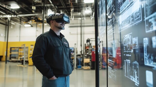 Industrial engineer wearing a vr headset is analyzing data displayed on a transparent digital screen, immersed in a virtual reality experience within a modern factory setting