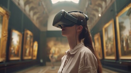Young Woman Wearing Virtual Reality Headset In Art Museum Gallery. Generative AI