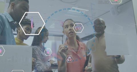 Diverse team brainstorming with augmented reality overlay on glass wall in office