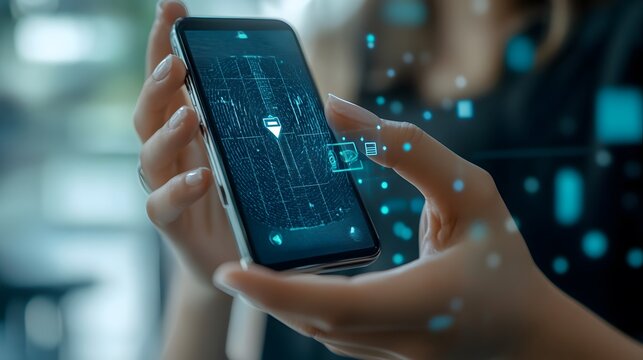 Person interacting with smartphone and digital interface elements