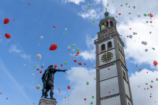 Turamichele celebration with ballons in front of Perlach tower in Augsburg, Germany, Bavaria