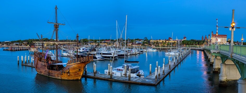Panoramic shot of a port with moored ships and boats in St. Augustine, Florida