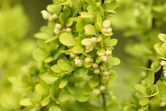 Blooming barberry closeup. Berberis thunbergii aurea green leaves background.