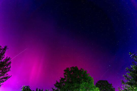 Nupaky, Czech republic - May 10, 2024 - Panorama of Aurora Borealis above Prague and Ricany