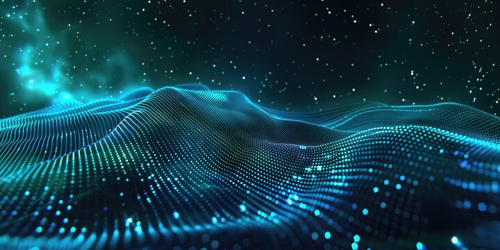 Futuristic Digital Terrain with Starry Night and Northern Lights, Dynamic 3D Landscape with Green Aurora Borealis for Sci-fi Background
