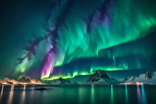 The starry sky serves as a backdrop for the dance of the northern lights, painting the landscape in hues of green and purple  generative ai technology