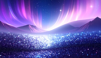 Surreal night landscape with sparkling terrain, jagged mountains, and vibrant auroras in purple, pink, and blue hues under a starry sky.