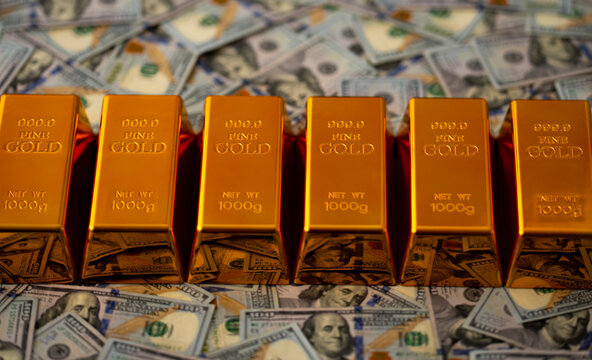 Gold bars and money. Golden bars stacked with US dollars in background. Gold bars for secure capital growth. Dollars money and gold concept. Financial success and saving Gold.