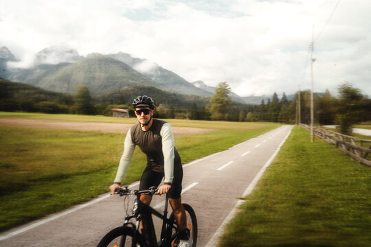 Mann mit Bart und kurzer Kleidung mit Fahrradhelm fährt mit seinem Mountainbike durch die Bikewelt Karnische Alpen in Nassfeld in Kärnten Österreich