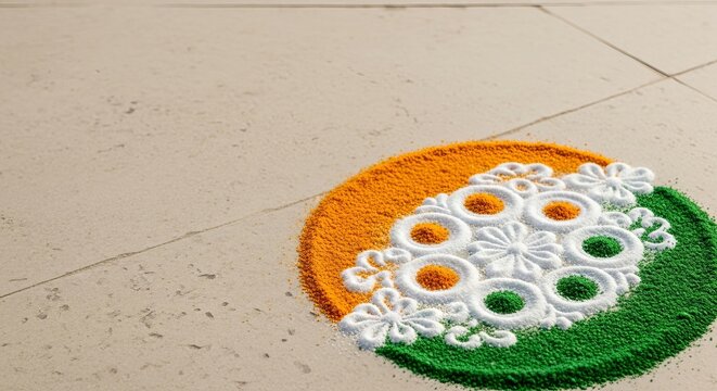 Vibrant tricolor rangoli design on the floor, symbolizing India Republic Day celebrations and patriotic cultural concept.