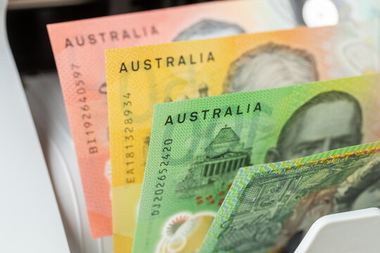 Australia money. Australian dollars in a bill counter. Financial and business concept. AUD currency. Various banknotes