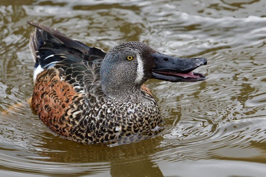 Close up of a male Australasian shoveler (spatula rhynchotis) swimming in the water