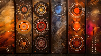 Indigenous Australian Aboriginal Art on Six Vertical Boards Featuring Diverse Dot Painting. Concept Indigenous Art, Aboriginal Culture, Dot Painting, Vertical Boards, Diverse Representation