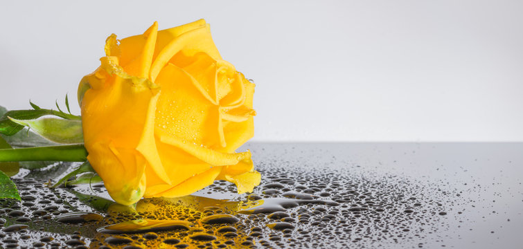 Zarte gelbe Rose mit Tautropfen im sanften Bokeh