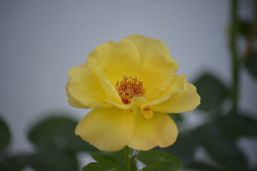 Beautiful yellow Rosa foetida in the garden. Austrian briar, Persian yellow rose, Austrian copper rose.