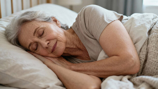 Realistic lifestyle photo of a senior woman sleeping peacefully in a cozy bedroom with soft natural light, authentic skin texture, healthy aging, recovery, and calm wellness atmosphere