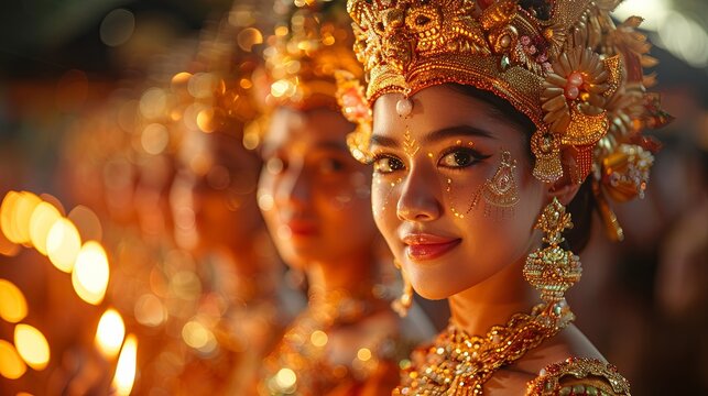 buddha statue in the temple Balinese Legong dancers ornate golden headdresses