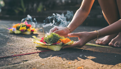 Hands holding traditional Balinese flower offering with incense smoke