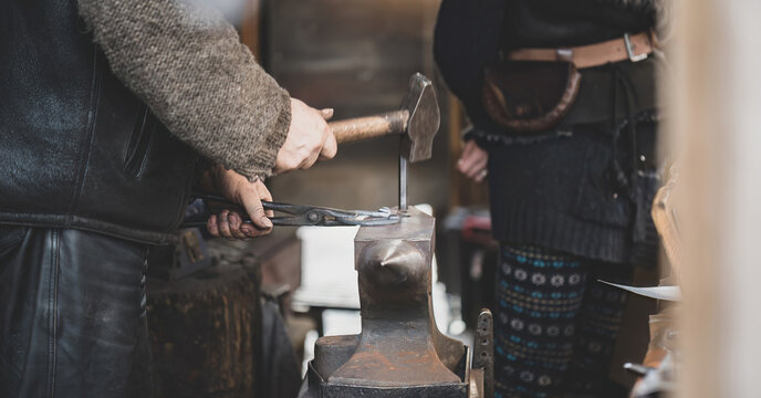 Blacksmith hammering metal on anvil with tongs in a traditional smithy workshop historical reenactment closeup of hands and tools forging steel in old style craft artisan manufacturing process concept