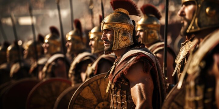 gladiator helmet and shield resting on sand before combat, authentic historical weaponry