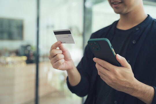 Handsome man holding credit card and smartphone contemplating online shopping at home.