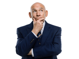 Bald senior executive in navy suit contemplating with hand on chin on a transparent background, concept for strategic planning, problem-solving and executive decisions