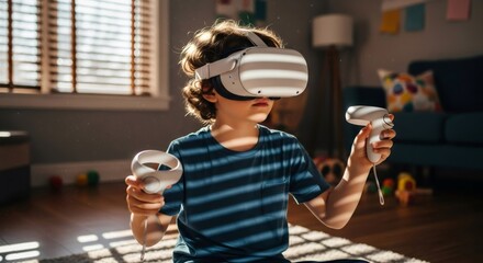 Young boy uses virtual reality headset and controllers to interact with a digital world. Concept of innovative therapy and learning for autism support.
