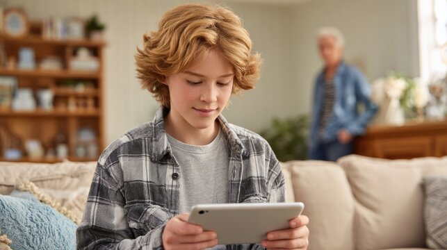 Autistic boy using tablet at home with parent nearby. Child with autism spectrum disorder concentrating on digital task. Family support, neurodiversity and inclusive technology in everyday life