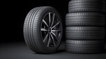 Close up of a new car tire with a detailed tread pattern next to a stack of identical tires against a dark background