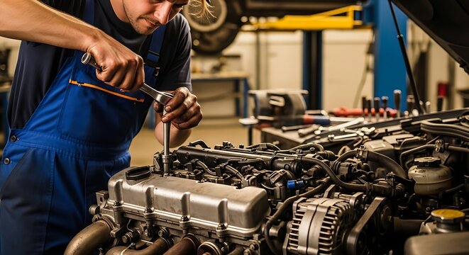 Auto mechanic performing engine maintenance in garage