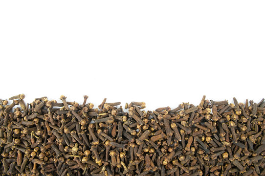 Dried clove tree arrange lower horizontal with empty space above on white background. Raw material ingredient for herbal food and herbal therapy.