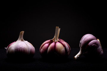 Close up of three red garlic lots with the middle one peeled skin showing the individual parts in studio with dramatic light against a dark background