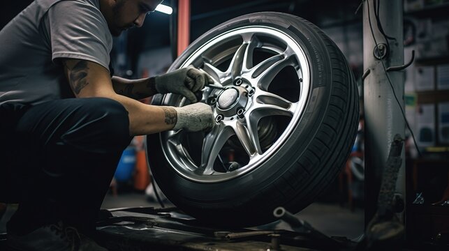 Auto mechanic working at auto repair shop. An auto repair shop repairs a car wheel, hands and cleats in the frame