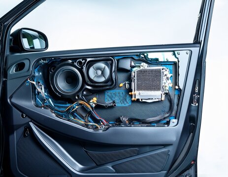 car door without panel closeup showing inner mechanism wiring speaker and handle useful for auto repair electronics diy tutorials mechanical education car maintenance engineering content