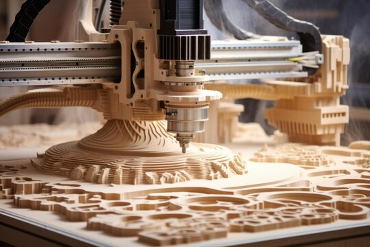 Cnc milling machine carving an intricate architectural model from wood, showcasing precision and automation in modern woodworking