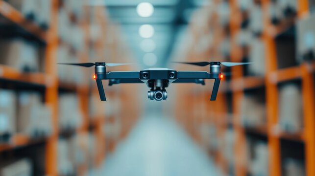 Automated warehouse drones scanning shelves for a futuristic logistics solution with deep depth of field showcasing the of robotic intelligence