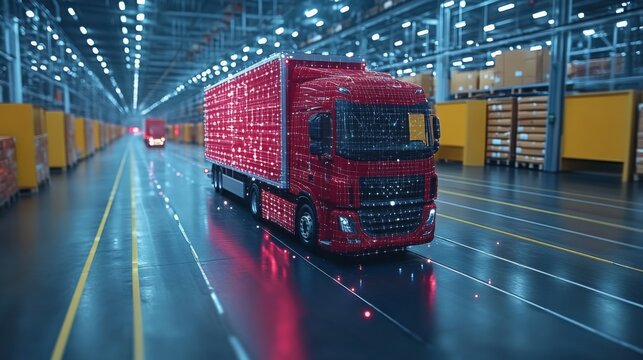 Modern warehouse with data overlay on industrial logistics background