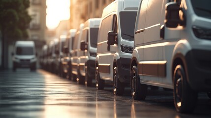 A fleet of modern delivery vans parked in an organized row, ready for dispatch on blurred background